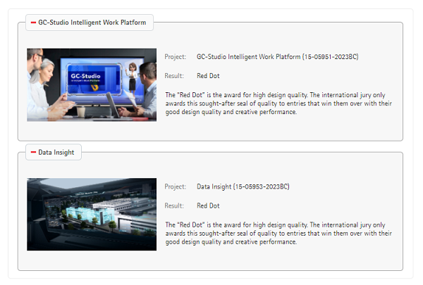 其中,紅點(diǎn)傳達(dá)設(shè)計(jì)獎(jiǎng)是紅點(diǎn)獎(jiǎng)重要分支之一,其全稱為“紅點(diǎn)品牌與視覺傳達(dá)設(shè)計(jì)獎(jiǎng)”,主要收錄世界優(yōu)秀的視覺藝術(shù)設(shè)計(jì)作品。此次獲獎(jiǎng)的移動(dòng)云數(shù)據(jù)可視化DataInsight與GC-Studio智作平臺(tái),不僅有優(yōu)秀的設(shè)計(jì)理念、新穎的視覺界面設(shè)計(jì),并且還能夠滿足當(dāng)下各類業(yè)務(wù)場(chǎng)景的數(shù)智化需求。