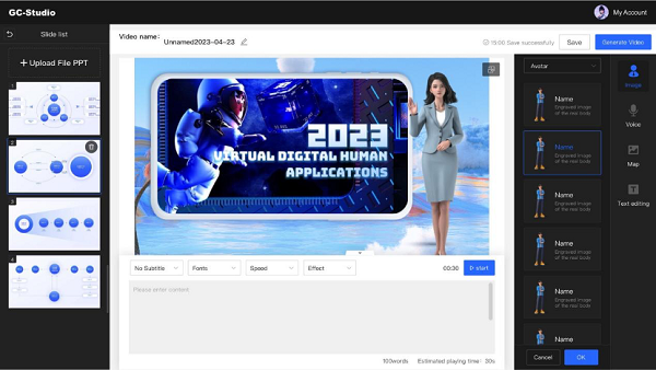GC-Studio通過最大限度減少傳統(tǒng)視頻制作的人工介入,有效降低使用門檻、提升交互體驗(yàn),大幅節(jié)約了人力資源和物力消耗。企業(yè)只需設(shè)置數(shù)字人參數(shù),即可獲得一個(gè)適合公司形象的、專業(yè)的、可24小時(shí)無間斷工作的數(shù)字講解員。