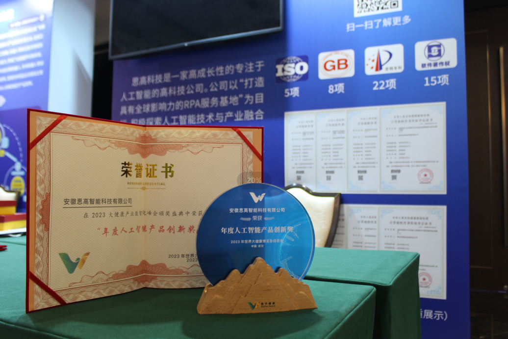 在頒獎(jiǎng)環(huán)節(jié)中,思高科技憑借公司核心人工智能軟件產(chǎn)品——“RPA+AI數(shù)字員工”的產(chǎn)品實(shí)力和技術(shù)創(chuàng)新榮獲“年度人工智能產(chǎn)品創(chuàng)新獎(jiǎng) ”,思高科技董事長付磊憑借在助推大健康產(chǎn)業(yè)數(shù)字化轉(zhuǎn)型中的突出貢獻(xiàn)榮獲“年度大健康產(chǎn)業(yè)數(shù)字化創(chuàng)新人物獎(jiǎng)”,獎(jiǎng)項(xiàng)的獲得不僅是對公司人工智能技術(shù)的實(shí)力認(rèn)可,也是對公司在大健康產(chǎn)業(yè)的持續(xù)創(chuàng)新和進(jìn)步的肯定。
