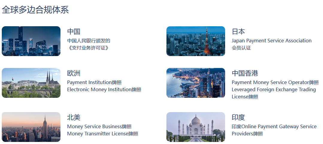 作為資金流服務(wù)的關(guān)鍵環(huán)節(jié),支付在多數(shù)國(guó)家都是重點(diǎn)監(jiān)管的項(xiàng)目。在跨境匯兌、資金分發(fā)等服務(wù)中,支付牌照作為展業(yè)的基礎(chǔ),是企業(yè)合規(guī)能力的直接體現(xiàn)。多年來(lái),PingPong福貿(mào)始終堅(jiān)持“牌照先行,資質(zhì)先行”理念,致力于在全球范圍內(nèi)多個(gè)主要經(jīng)濟(jì)體國(guó)家及地區(qū)爭(zhēng)取獲得合規(guī)牌照,以打造堅(jiān)實(shí)穩(wěn)固的全球多邊合規(guī)體系。目前已擁有中國(guó)、歐洲、美國(guó)、日本、印度、澳大利亞等主要經(jīng)濟(jì)體的數(shù)十張支付類牌照及認(rèn)證資質(zhì),是國(guó)內(nèi)少有的雙邊持牌支付企業(yè)。