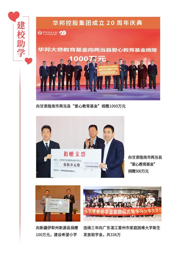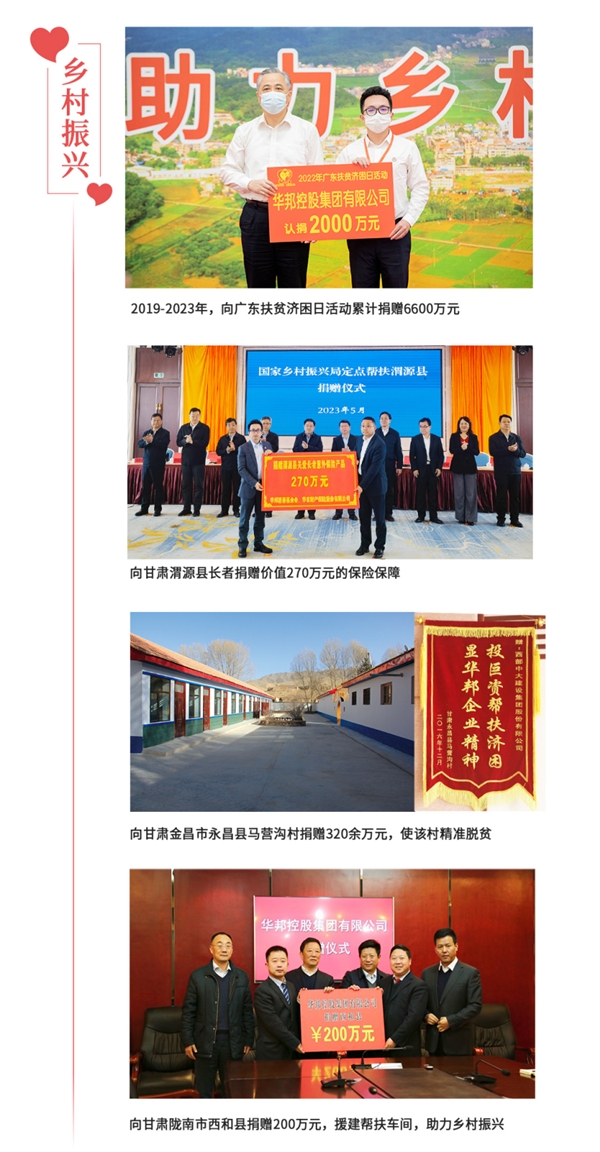 利合一,回報(bào)社會(huì)。23年來,華邦控股集團(tuán)不斷發(fā)展壯大,實(shí)現(xiàn)高質(zhì)量發(fā)展,得益于時(shí)代,得益于黨和政府及社會(huì)各界的關(guān)心與支持。助力鄉(xiāng)村振興,僅是華邦履行社會(huì)責(zé)任的縮影。華邦作為廣東省百?gòu)?qiáng)民營(yíng)企業(yè),始終心懷感恩,勇于擔(dān)當(dāng),用心用情投身于各項(xiàng)慈善公益事業(yè),回饋社會(huì)。迄今為止,華邦在鄉(xiāng)村振興、建校助學(xué)、賑災(zāi)援助等公益領(lǐng)域累計(jì)捐款捐物數(shù)億元。