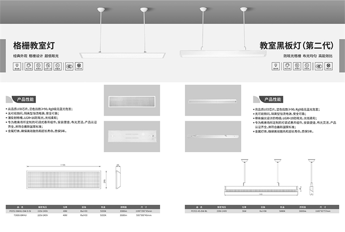 其中,LED UGR教室燈設計輕薄,造型簡約,能夠讓教室煥然一新;LED直下式教室燈采用微棱鏡擴散板,發(fā)光均勻柔和;LED格柵教室燈采用格柵面板設計,光線均勻柔和;LED黑板燈采用漫反射型光柵,高光效,低能耗。
