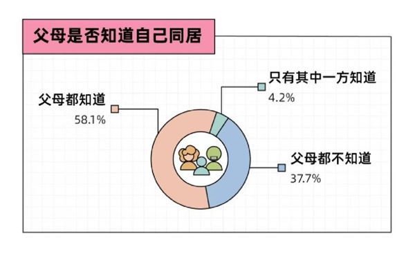 尤其值得注意的是,根據(jù)《報(bào)告》,37.7%的年輕人壓根就沒讓父母知道自己已經(jīng)同居,還有4.2%的受訪者表示只讓父母中的一方知道情況。畢竟,父母對待同居的態(tài)度相對保守,尤其是女方,《報(bào)告》顯示僅有約三分之一的父母支持女生同居。