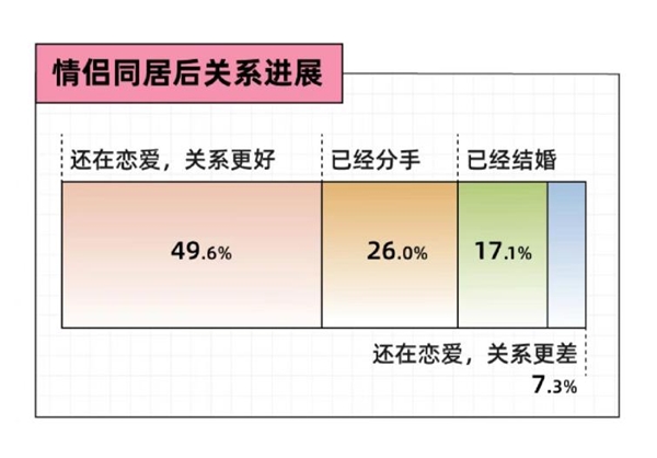 “同居分離會產(chǎn)生焦慮癥嗎”“試婚同居生子男方棄養(yǎng)”“同居該不該AA”……微博熱搜榜上,同居始終是一大熱門爭議話題。當(dāng)熱戀期的完美形象分崩離析,留給同居的年輕人的,是否只是一地雞毛?實(shí)際上,《報(bào)告》顯示,多數(shù)同居關(guān)系有著美好結(jié)局。