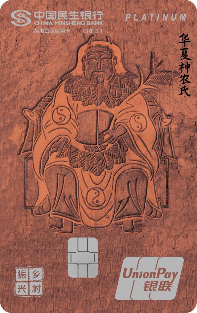 該卡首次采用民生銀行定點(diǎn)幫扶縣——河南省滑縣國家級(jí)非遺木版年畫為版面,卡面以華夏神農(nóng)氏為主形象,形象地描繪出農(nóng)耕文化和民族風(fēng)情,展現(xiàn)了中華傳統(tǒng)美術(shù)工藝,為金融機(jī)構(gòu)助力鄉(xiāng)村振興又添碩果。