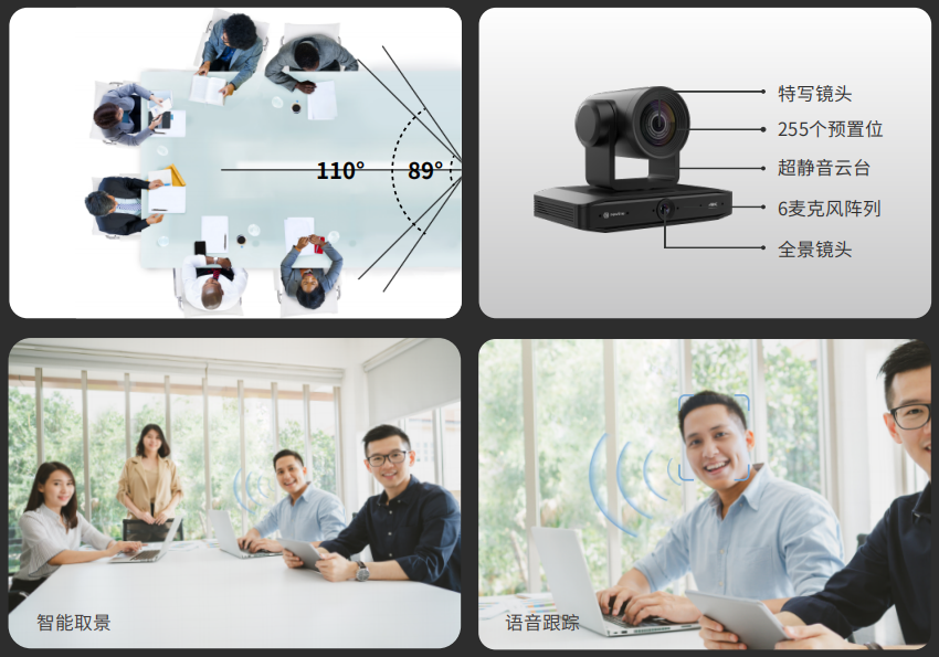 攝像系統(tǒng)由12倍光學(xué)變焦特寫鏡頭和110°大廣角的全景鏡頭組成,特寫鏡頭可視角達(dá)89°,可將畫面無損放大至12倍,加上自動對焦,不僅能捕捉所有參會人的表情和動作,會議室中的文件和白板內(nèi)容都能在遠(yuǎn)端輕松觀看。同時,作為一款會議云臺攝像頭,它能通過6顆麥克風(fēng)陣列,鎖定發(fā)言人位置,電機實時穩(wěn)定安靜快速地運行轉(zhuǎn)動到當(dāng)前發(fā)言人,覆蓋會議室多個角度,讓遠(yuǎn)程的參會人更具沉浸感和參與感。