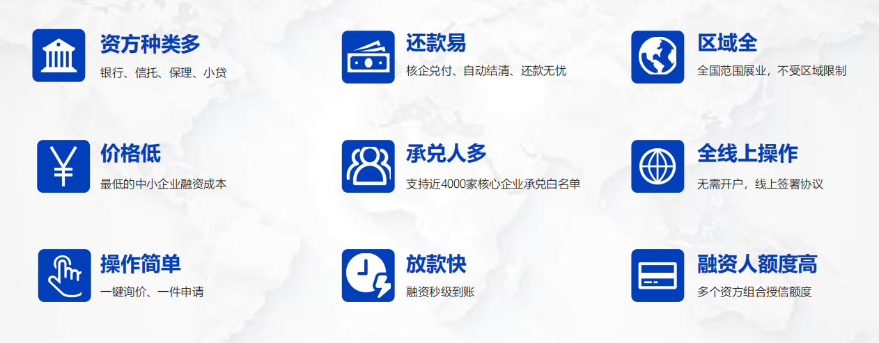 3、融資額度高、到期還款易 :融資人享受多個資方組合授信額度,核心企業(yè)兌付,到期自動結(jié)清、還款無憂。