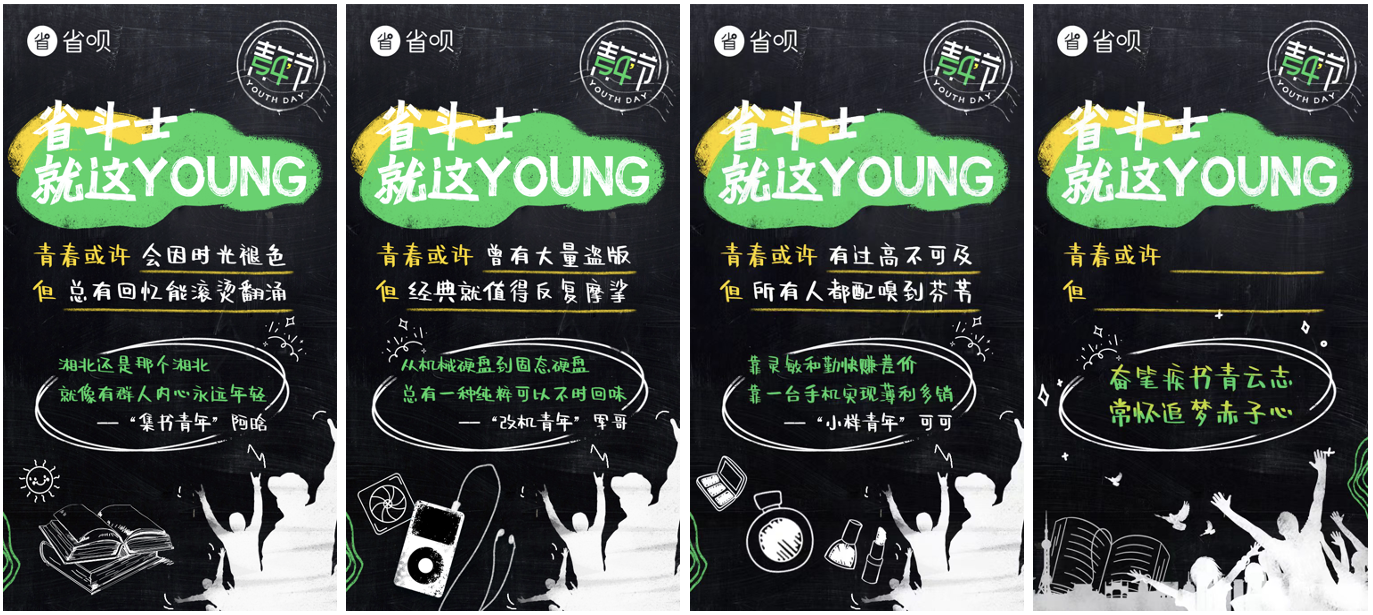 風(fēng)好正是揚(yáng)帆時(shí),策馬揚(yáng)鞭再奮蹄。和集書青年阿晗、改機(jī)青年軍哥、小樣青年可可這樣將愛好做成生意的人還有很多,他們也是無數(shù)年輕追夢(mèng)人的代表,有著這個(gè)時(shí)代后浪群體的可貴品質(zhì)。恰逢五四青年節(jié),數(shù)字化優(yōu)惠服務(wù)平臺(tái)省唄也為這些年輕的“省斗士”歡呼喝彩,一組#省斗士 就這YOUNG#的海報(bào),不僅描繪出上述青年代表的風(fēng)貌,還以“青春或許_______,但_______”的句式引發(fā)網(wǎng)友的共鳴,激發(fā)年輕人表達(dá)內(nèi)心炙熱,以真誠(chéng)博取喝彩與鼓勵(lì)?!扒啻夯蛟S稍縱即逝,但造就了全新的自己”、“ 青春或許是這白開水一樣淡的日子,但更多的還是相互成就和相互溫暖”、……短短半天不到,話題閱讀量就已突破1600萬。