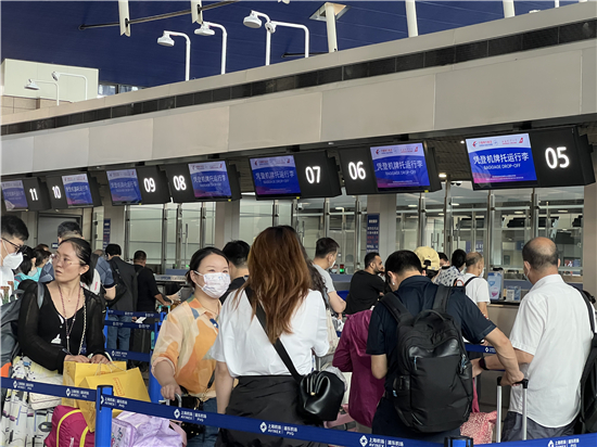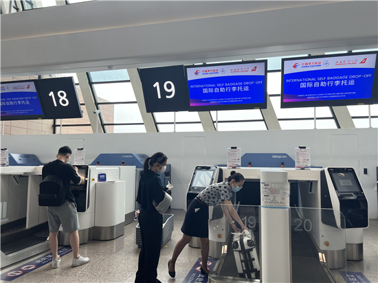 暑運(yùn)期間客流上升,東航充分發(fā)揮上海虹橋、浦東兩場(chǎng)候機(jī)樓國(guó)內(nèi)、國(guó)際值機(jī)區(qū)自助值機(jī)設(shè)備和自助行李托運(yùn)設(shè)備作用,在客流高峰時(shí)段,對(duì)排長(zhǎng)隊(duì)的旅客進(jìn)行分流。