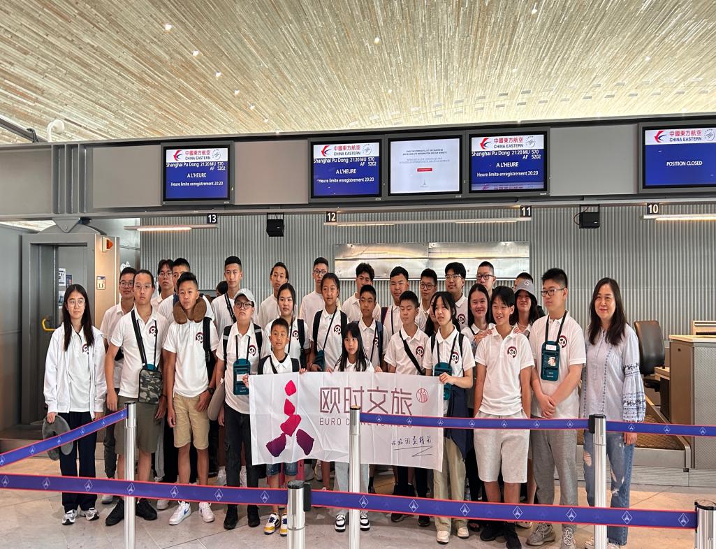 夏令營(yíng)全體成員在巴黎戴高樂國(guó)際機(jī)場(chǎng)集結(jié)出發(fā)。