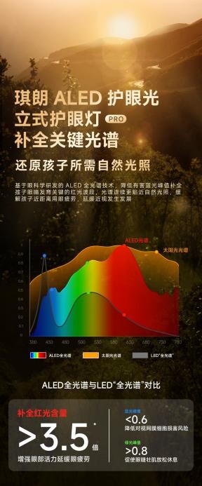 為此,琪朗以“為人類創(chuàng)造舒適的健康光環(huán)境”為使命,致力打造中國千萬兒童房專用護(hù)眼光環(huán)境。2022年,琪朗聯(lián)合中山大學(xué)中山眼科中心共同研發(fā)全新專利技術(shù)ALED護(hù)眼光。新一代ALED護(hù)眼光其原理是打造與太陽光的可見光譜接近的照明光譜,通過降低有害藍(lán)光峰值,補全孩子眼睛發(fā)育關(guān)鍵的紅光波段,緩解孩子近距離用眼疲勞,延緩近視發(fā)生發(fā)展。自從愛迪生發(fā)明光源以來,經(jīng)歷了白熾燈、鹵素?zé)?、熒光燈、LED燈后,ALED護(hù)眼光是人類史上最近接太陽光譜的光源,其光源更護(hù)眼,更舒適,更健康。