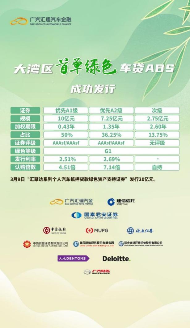 與此同時,廣汽匯理良好的綠色金融資產(chǎn)也獲得了資本市場的認(rèn)可。今年3月9日,廣汽匯理發(fā)行了粵港澳大灣區(qū)首單綠色車貸ABS——匯聚達(dá)2023年第一期個人汽車抵押貸款綠色資產(chǎn)支持證券。本次入池資產(chǎn)均為廣汽埃安品牌新能源汽車個人貸款,經(jīng)綠色認(rèn)證機(jī)構(gòu)聯(lián)合赤道評估分析,入池資產(chǎn)對應(yīng)的新能源汽車,預(yù)計(jì)每年可實(shí)現(xiàn)二氧化碳減排6.07萬噸,節(jié)約標(biāo)準(zhǔn)煤2.85萬噸,有效地助力了我國節(jié)能減排事業(yè)開展。