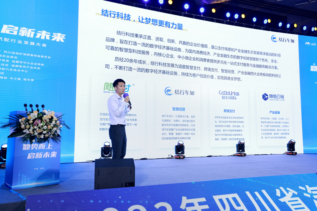 2023年6月11日,由四川省汽車汽配服務業(yè)商會主辦、豆秒好車集團承辦的“2023年四川省汽車汽配行業(yè)發(fā)展大會”在成都隆重舉行,本次峰會以“鼎勢而上·啟新未來”為主題,廣邀800+車商和四川及全國汽車行業(yè)商協(xié)會、政府主管部門等相聚蓉城,共商行業(yè)的變革與機遇。結(jié)行科技旗下汽車資產(chǎn)數(shù)字化服務平臺結(jié)行車加也受邀參會,副總經(jīng)理史云峰先生在會上做了精彩分享。