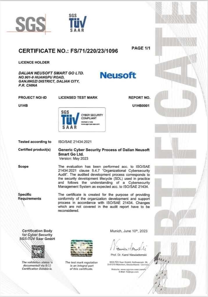 從產(chǎn)品開(kāi)發(fā)到組織管理,東軟將汽車電子與網(wǎng)絡(luò)安全高度融合,形成一整套汽車網(wǎng)絡(luò)安全管理流程,覆蓋智能網(wǎng)聯(lián)汽車安全的整個(gè)生命周期,踐行對(duì)客戶持續(xù)全面保障網(wǎng)絡(luò)安全服務(wù)的鄭重承諾,也由此順利完成管理體系認(rèn)證的全部?jī)?nèi)容并獲得了認(rèn)證證書,得到了SGS的高度稱贊。