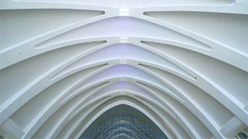 登錄廳“鳥喙”造型凈高34m,頂端懸挑長度達(dá)到6m。梁柱縱橫交錯、網(wǎng)狀交織。八局裝飾采用裝配式設(shè)計施工方法,現(xiàn)場組裝、單元吊裝、多條安裝線流水施工,完成1400塊雙曲異形超長鋁板快速安裝,輔以9953盞Dmax-512系統(tǒng)RGBW調(diào)光燈,營造流光溢彩的視覺效果,讓建筑空間更具藝術(shù)特性。