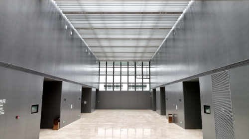 凈高8.3米的室內(nèi),古銅不銹鋼墻面,超高干掛式硬包,以及高大古樸的仿銅門,凸顯恢宏大氣的廳內(nèi)空間。