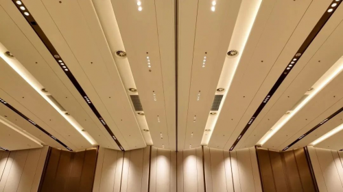 會議門廳,與兩側(cè)VIP前室相連,向北聯(lián)通室外廣場,挑高最高處達(dá)24米,采用香檳金色蜂窩鋁板,整體造型呼應(yīng)建筑鳳“翼”舒展的形態(tài),向北廣場方向傾斜5°。