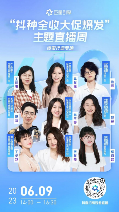 關(guān)注“巨量引擎小助手”抖音號(hào),6月9日14:00,來(lái)線索行業(yè)618直播專場(chǎng),了解更多活動(dòng)政策及作戰(zhàn)攻略。