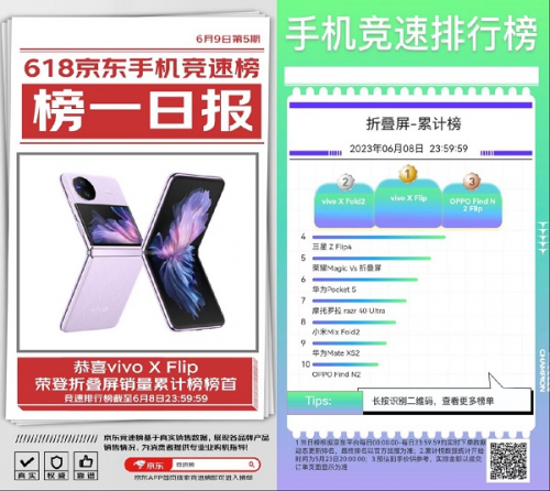 最近京東618火熱進行中,囤完日用品,也該將自己卡頓或拍攝性能落后的手機換新了。除了性能出色的直板智能機,還可以選擇嘗鮮,換新折疊屏手機試試。不過很多人都表示自己平時也不關注手機圈的事情,配置也就看個大概,不知道怎么選。沒關系,京東618推出了手機競速排行榜,京東APP搜索“競速榜”即可進入,不同喜好和預算都能選到適合的產(chǎn)品,其中就有折疊屏手機銷量累計榜。截至6月8日,vivo X Flip、vivo X Fold2、OPPO Find N2 Flip成為折疊屏手機銷量累計榜TOP3,下面就帶大家一起看看這些在榜折疊屏手機。