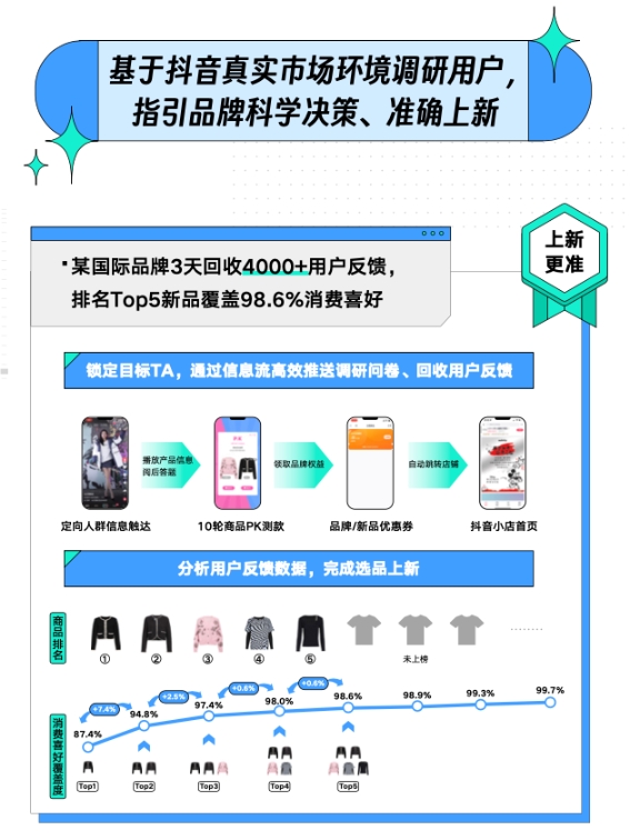 某國際服裝品牌在選品上新時使用巨量云圖“新品實驗室”的測品能力,僅用時三天就回收了超過4000份目標(biāo)用戶反饋,選出的貨品,也成為后續(xù)品牌直播間銷量冠軍,為店鋪GMV的主力貢獻(xiàn)商品。獲得這樣的上新成績是因為巨量云圖在測品的每個細(xì)節(jié)都試圖降低誤差,從而最大程度還原消費者真實意愿。