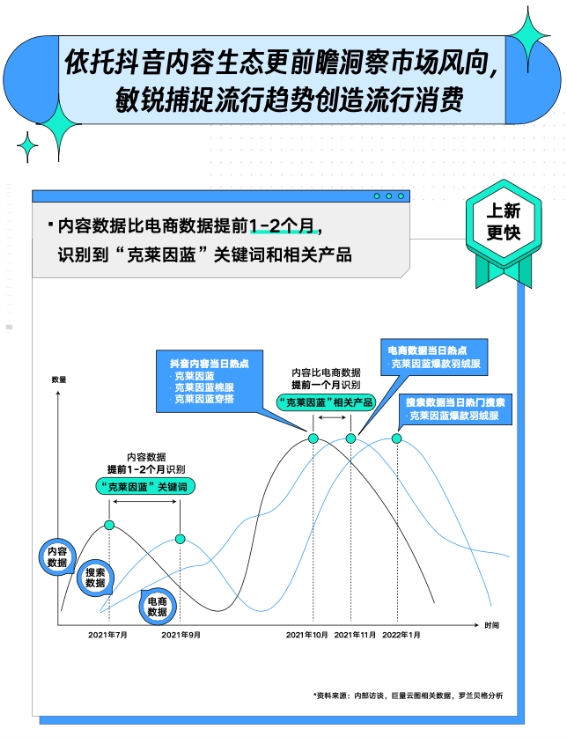 看似無序的消費決策遵循一套基礎(chǔ)邏輯,比如購買普遍發(fā)生在瀏覽和搜索之后。所以,內(nèi)容數(shù)據(jù)和搜索數(shù)據(jù)可以被視為交易的前置指標(biāo),它們能夠更早預(yù)測未來交易走向。正是基于這一結(jié)論,擁有內(nèi)容場監(jiān)測能力的巨量云圖能更快識別出新品市場機會,為品牌上新提供參考。
