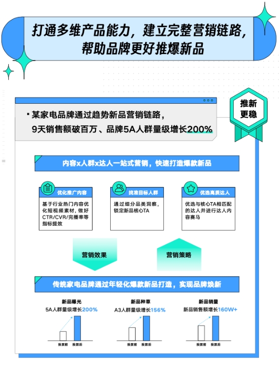 最近,巨量云圖發(fā)布了「新品C位出道指南」,提供 看機會、測產(chǎn)品和推爆款 全鏈路能力,讓品牌能夠更快速地洞察機遇、更準(zhǔn)確地測試產(chǎn)品以及更穩(wěn)健地推動新品打爆,核心目標(biāo)就是借用營銷科學(xué)手段幫助商家真正實現(xiàn) 快、準(zhǔn)、穩(wěn) 地上新。