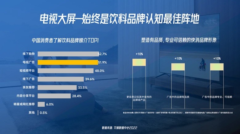 根據(jù)艾媒數(shù)據(jù)中心2022的統(tǒng)計(jì)分析,電視廣告是中國(guó)消費(fèi)者了解飲料品牌的第一媒介,是建設(shè)飲料品牌認(rèn)知的最佳陣地,有助于塑造高品質(zhì)、可信賴的品牌形象。