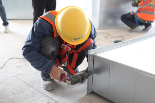 本次競賽分為風(fēng)管加工及安裝、支架焊接兩項(xiàng)分項(xiàng)競賽。在風(fēng)管加工及安裝分項(xiàng)競賽中,評(píng)委組選取防排煙系統(tǒng)分支三通作為競賽內(nèi)容,提供風(fēng)管三通半成品部件,參賽工人結(jié)合原設(shè)計(jì)圖紙,開展風(fēng)管合口、法蘭鉚接及風(fēng)管安裝作業(yè)。在支架焊接分項(xiàng)競賽中,評(píng)委組選取統(tǒng)一的綜合支架,繪制大樣圖,提供相關(guān)工具及材料,參賽人員按照?qǐng)D紙下料、焊接并完成綜合支架施工。