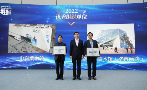 劉斯杰為山東美術(shù)館、濟南市美術(shù)館(濟南畫院)兩家優(yōu)秀組織單位頒發(fā)了獎牌。