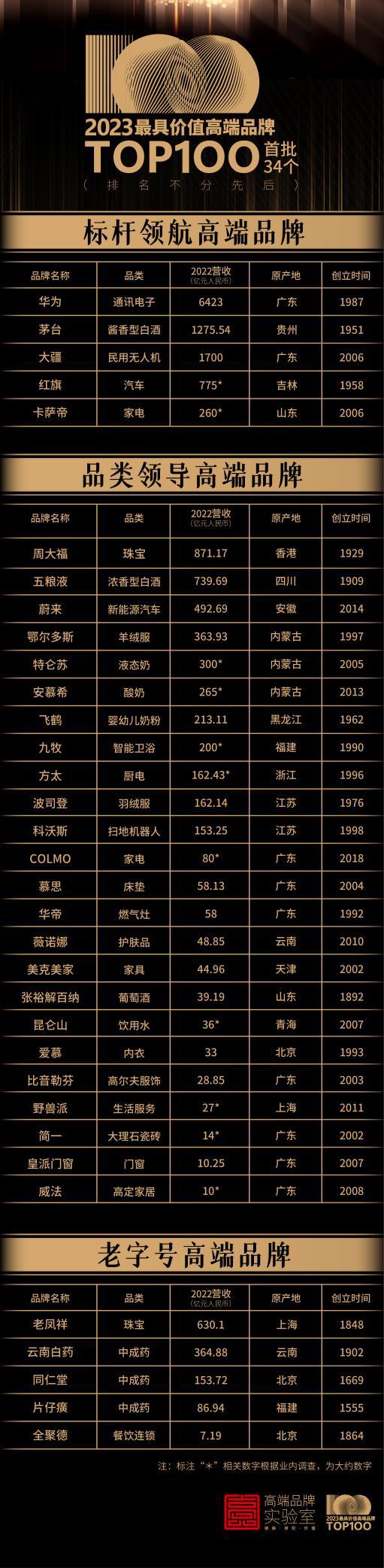 這份擁有34個(gè)品牌的榜單分為三類:標(biāo)桿領(lǐng)航品牌榜、品類領(lǐng)導(dǎo)品牌榜和老字號(hào)品牌榜。發(fā)布方表示,首批標(biāo)桿領(lǐng)航品牌榜有5個(gè)品牌入圍:華為、茅臺(tái)、卡薩帝、大疆、紅旗。它們的入圍標(biāo)準(zhǔn)是:擁有全球化的經(jīng)營和影響力、100億以上的營收規(guī)模和公認(rèn)的高端市場地位。“老字號(hào)品牌榜”的推出旨在支持中國老字號(hào)品牌的建設(shè),入選的五個(gè)品牌——老鳳祥、云南白藥、同仁堂、片仔癀、全聚德,顯示中華老字號(hào)擁有廣闊的品牌建設(shè)空間。至于品類領(lǐng)導(dǎo)品牌則囊括了近20多個(gè)細(xì)分行業(yè)(品類)的24個(gè)領(lǐng)導(dǎo)品牌,它們基本是這些細(xì)分行業(yè)的品類冠軍。