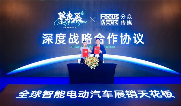 發(fā)布會(huì)現(xiàn)場,還進(jìn)行了CAS華車展與分眾傳媒深度戰(zhàn)略合作簽約儀式,華墨集團(tuán)CEO王國平與分眾傳媒董事長江南春共同簽署了“助力全球智能電動(dòng)汽車品銷雙贏”戰(zhàn)略合作。