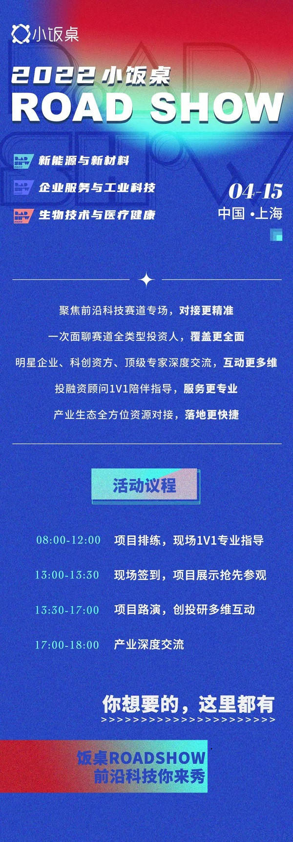 為此,小飯桌重磅推出的高質(zhì)量創(chuàng)業(yè)項目路演活動——小飯桌ROADSHOW,將于4月15日在上海舉辦,聚焦“新能源與新材料”、“企業(yè)服務與工業(yè)科技”、“生物技術與醫(yī)療健康”三大賽道,與創(chuàng)業(yè)者、投資人、科研專家三向深度互動,凝聚國內(nèi)最前沿的科技力量,為中國新經(jīng)濟的快速發(fā)展貢獻價值。