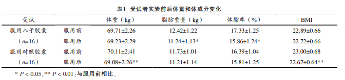 國(guó)家體育總局運(yùn)動(dòng)醫(yī)學(xué)研究所的一項(xiàng)針對(duì)男子足球運(yùn)動(dòng)員賽前準(zhǔn)備期和比賽期血液生化指標(biāo)和運(yùn)動(dòng)能力的研究表明,服用八子補(bǔ)腎膠囊受試者實(shí)驗(yàn)后,脂肪重量和體脂率較實(shí)驗(yàn)前明顯降低[3](見表1)。