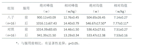 在減少脂肪含量的同時(shí),還要注意增加肌肉量。這里要關(guān)注一個(gè)指標(biāo),無(wú)氧運(yùn)動(dòng)能力。無(wú)氧運(yùn)動(dòng)能力是人體基本運(yùn)動(dòng)能力之一,主要反映機(jī)體骨骼肌在不同運(yùn)動(dòng)階段短時(shí)快速激烈運(yùn)動(dòng)的一種運(yùn)動(dòng)能力。來自國(guó)家運(yùn)動(dòng)營(yíng)養(yǎng)測(cè)試研究中心的一項(xiàng)實(shí)驗(yàn)報(bào)告表明,服用“八子補(bǔ)腎膠囊”后運(yùn)動(dòng)員的無(wú)氧功率平均值和相對(duì)無(wú)氧功率平均值明顯升高,說明“八子補(bǔ)腎膠囊”可以提高無(wú)氧運(yùn)動(dòng)能力[6](見表2)。