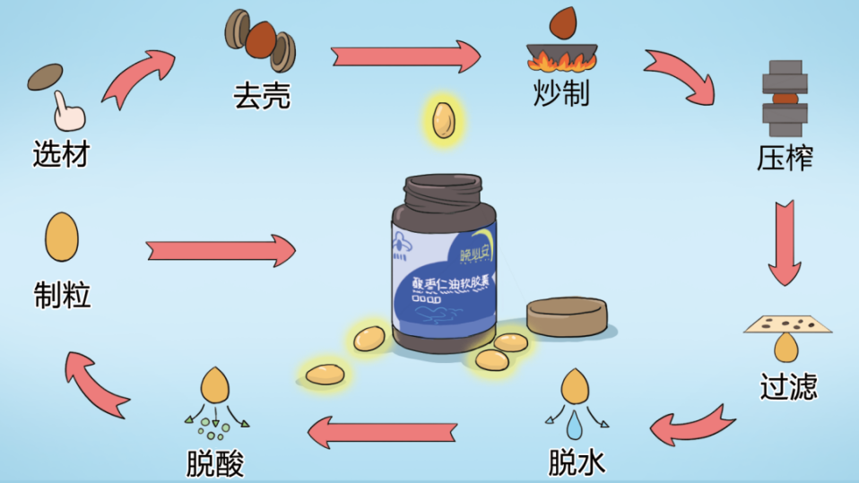 晚必安酸棗仁油軟膠囊就采用了這一工藝,低溫榨取,千倍濃縮,一千斤酸棗仁僅能得一斤油,最大程度保留了有效助眠成分。