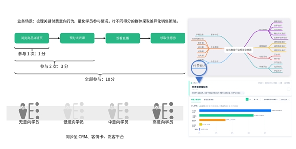 當學員與課程產(chǎn)品交互越多,用戶畫像就會越豐富,班主任對學員的復(fù)購、進階意向也就掌握得更精準,通過量化學員關(guān)鍵行為,及時跟進高意向?qū)W員,并對不同群體采取差異化銷售策略,以此提高學員復(fù)購率。