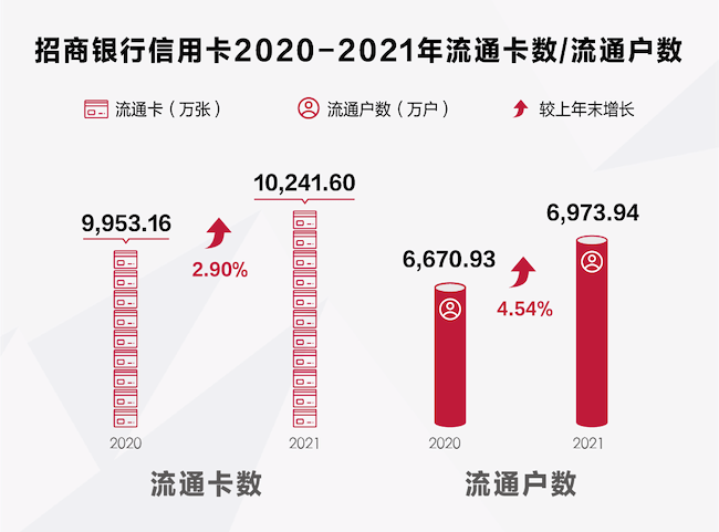 據(jù)財(cái)報(bào),截至2021年底,招行信用卡流通卡量10241.6萬(wàn)張,較上年末增長(zhǎng)2.9%,首次突破1億張;流通戶數(shù)6973.94萬(wàn)戶,較上年末增長(zhǎng)4.54%。招行信用卡流通卡量、流通戶數(shù)在高位穩(wěn)步增長(zhǎng),與其從客戶視角出發(fā)推動(dòng)產(chǎn)品升級(jí),完善豐富的產(chǎn)品矩陣不無(wú)關(guān)系。