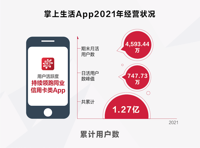 掌上生活A(yù)pp的這些舉措帶來(lái)了更高的數(shù)字化獲客水平和用戶增長(zhǎng)空間,為優(yōu)化用戶體驗(yàn)、增強(qiáng)用戶黏性提供了有效路徑。截至2021年底,掌上生活A(yù)pp累計(jì)用戶數(shù)1.27億戶,日活躍用戶數(shù)峰值747.73萬(wàn)戶,期末月活躍用戶數(shù)4593.44萬(wàn)戶,用戶活躍度居同業(yè)信用卡類(lèi)App前列。