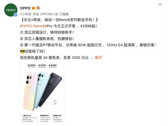 目前,OPPO Reno8 Pro已經(jīng)正式開(kāi)售,8+128GB版2999元、8+256GB版3199元、12+256GB版3499元,OPPO商城、天貓、京東等線上和OPPO線下門(mén)店均有現(xiàn)貨銷(xiāo)售,感興趣的可以了解一下。