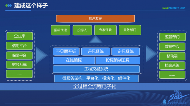 針對以上問題和挑戰(zhàn),并結合客戶對靈活性的高度要求,廣聯(lián)達依托自身在工程建設及公共資源交易領域的實踐經驗,梳理了一套具有廣州特色建設工程交易解決方案。方案采用微服務架構,具有可拓展、平臺化、組件化和模塊化等特性,從全面、靈活、智能和創(chuàng)新四個方面,助力廣州交易集團重構建設工程交易系統(tǒng),優(yōu)化建設工程招投標體驗。