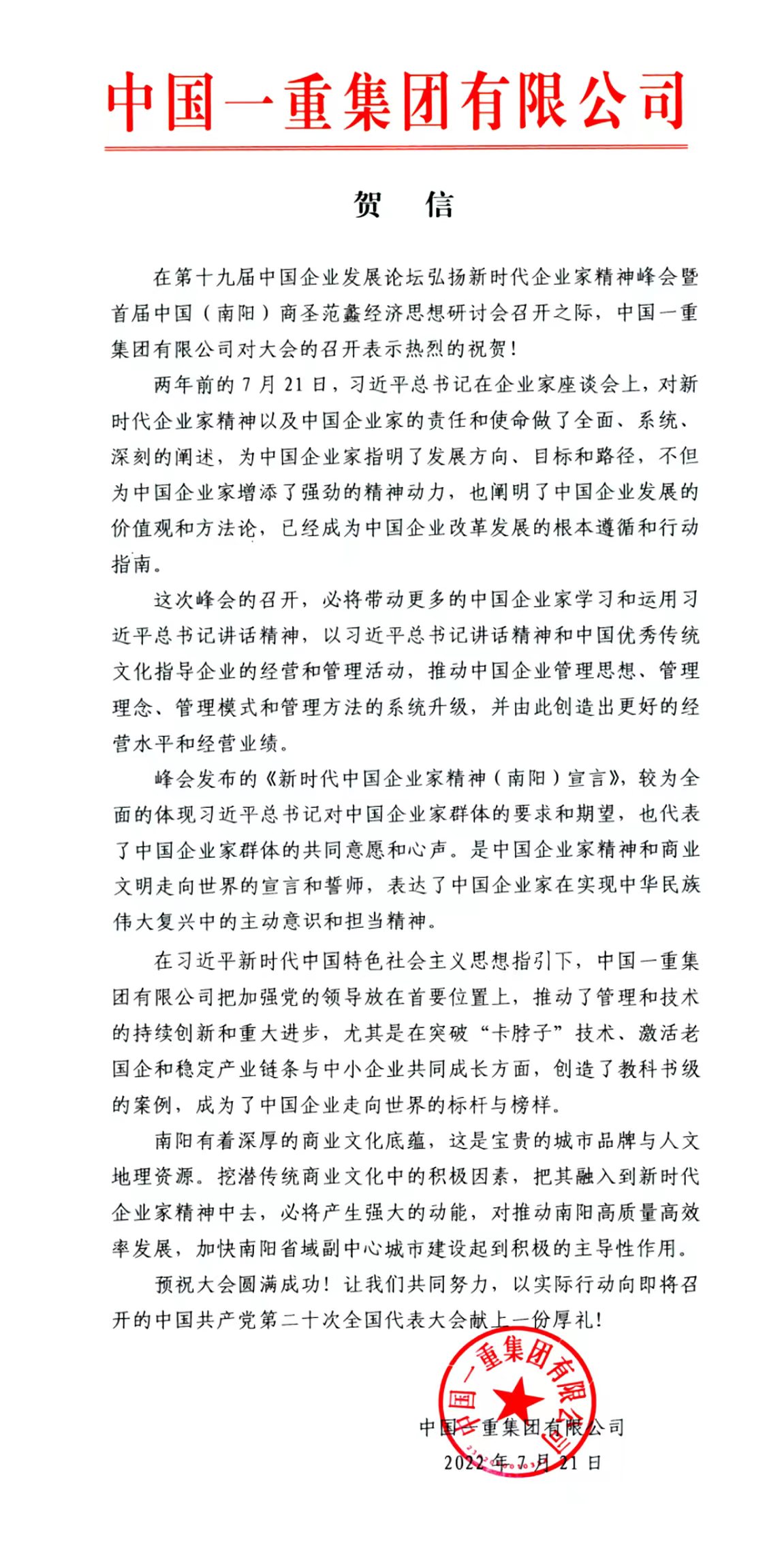 7月21日—7月22日,以“傳承中華優(yōu)秀文化,弘揚新時代企業(yè)家精神”為主題的第十九屆中國企業(yè)發(fā)展論壇弘揚新時代企業(yè)家精神峰會暨首屆中國(南陽)商圣范蠡經(jīng)濟文化研討會在河南省南陽市舉辦。本次研討會由中國企業(yè)聯(lián)合會、中國企業(yè)家協(xié)會、中國企業(yè)文化促進(jìn)會指導(dǎo),南陽市人民政府、《中國企業(yè)報》集團主辦,中共南陽市委宣傳部、南陽市工業(yè)和信息化局、南陽市招商投資促進(jìn)局、南陽理工學(xué)院、南陽市宛城區(qū)人民政府協(xié)辦?!吨袊髽I(yè)報》集團副社長、副總裁張博宣讀中國一重集團有限公司發(fā)來的賀信。