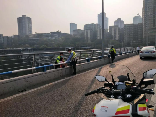 27歲的楊洋是上海英盾保安服務有限公司駐江北區(qū)公安分局交巡警支隊摩巡中隊(以下簡稱“渝警驍騎”)的一名隊員。2020年4月16日早上08時30分許,在渝澳大橋附近巡邏的楊洋突然接該支隊指揮室指令,稱渝澳大橋中間往渝中區(qū)方向有女子輕生。此時正值上班高峰期,交通堵塞嚴重。接到指令后的楊洋立馬騎上巡邏摩托車前往事發(fā)地段,在其到達離事發(fā)現(xiàn)場約10米左右的距離時,看到欲輕生女子已有一只腳跨出橋上欄桿,意欲再翻越欄桿跳下。此時有兩位民警正在耐心勸說,情況十分危急。