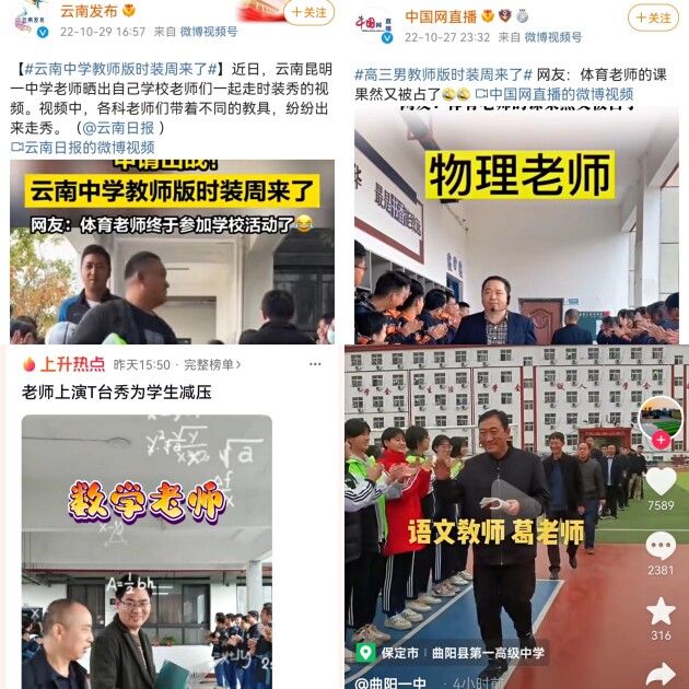 記者了解到,由于受疫情影響,不少學(xué)校采取了封控措施,為了豐富校園生活,減緩壓力,一些老師突發(fā)奇想,在校園中開(kāi)展“時(shí)裝走秀”活動(dòng),并將視頻上傳至微信、微博、抖音等社交平臺(tái),收獲了廣泛好評(píng)。之后,各地學(xué)校紛紛模仿,尤其是許多初高中任課老師“申請(qǐng)出戰(zhàn)”,希望通過(guò)展現(xiàn)自己的“另一面”, 讓那些背負(fù)升學(xué)壓力的同學(xué)們的緊張情緒得到有效釋放。