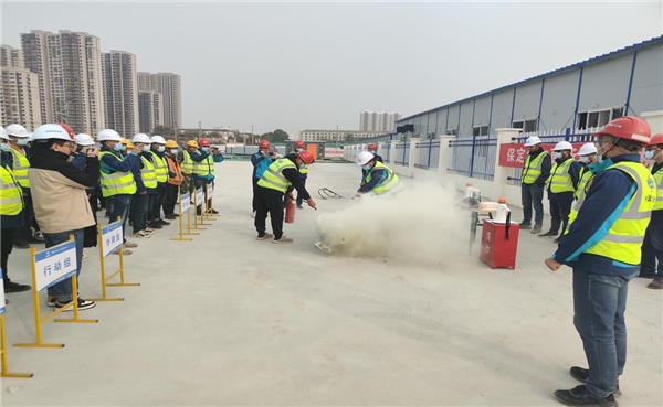 最后,在現場開展模擬火災救援演練,項目管理人員與施工作業(yè)人員進行現場滅火實操演練。