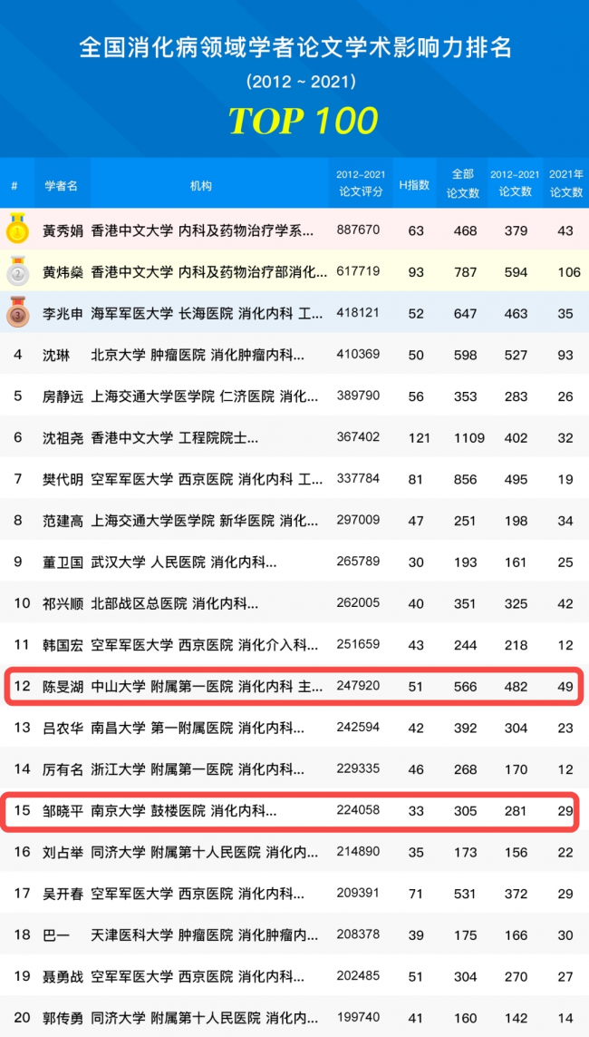 在今年全球?qū)W者庫(kù)發(fā)布的《2012-2021年全國(guó)消化病領(lǐng)域?qū)W者論文學(xué)術(shù)影響力排名》中,泰康醫(yī)療旗下深圳前海泰康國(guó)際醫(yī)院(籌)高級(jí)顧問(wèn)陳旻湖教授與泰康仙林鼓樓醫(yī)院院長(zhǎng)鄒曉平教授雙雙入選TOP100。其中,陳旻湖教授以H指數(shù)(在一定期間內(nèi)發(fā)表的論文至少有h篇的被引頻次不低于h次)51、全部論文數(shù)566篇,位列全國(guó)總排名第12位;鄒曉平教授則以H指數(shù)33、全部論文數(shù)305篇,位列全國(guó)總排名第15位。