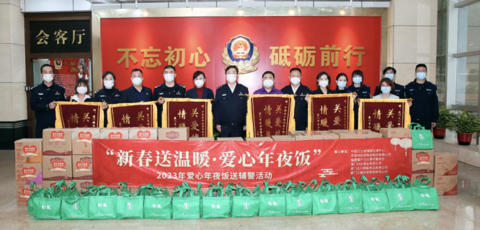 由中國(guó)企業(yè)報(bào)福建公司發(fā)起的“2023愛心年夜飯送輔警活動(dòng)”第三個(gè)中國(guó)人民警察節(jié)當(dāng)天在廈門市公安局大院隆重舉行,來(lái)自羅普特科技集團(tuán)股份有限公司、福建重宇合眾律師事務(wù)所、廈門綠進(jìn)食品有限公司、廈門達(dá)川臻富食品有限公司、廈門見福連鎖管理有限公司等愛心企業(yè)為廈門輔警支隊(duì)一線輔警送來(lái)了節(jié)日的問(wèn)候和預(yù)制菜、油、果汁等愛心年夜飯“大禮包”,以及口罩等防疫物資,向奮斗在在一線守護(hù)廈門城市平安的執(zhí)勤輔警表示感激和敬意。