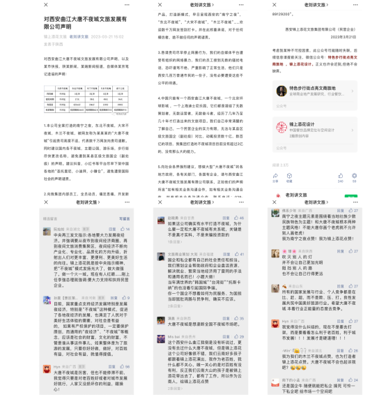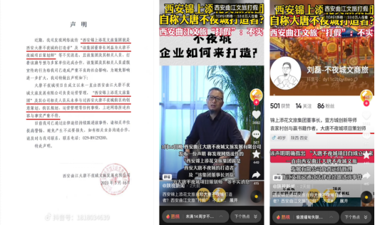 2023年3月16日,大唐不夜城官方率先在抖音、曲江文旅、大唐不夜城、曲江文化、微博、西安大唐不夜城等平臺官方認(rèn)證賬號上全網(wǎng)發(fā)布聲明,該聲明指出:發(fā)現(xiàn)網(wǎng)絡(luò)流傳的“西安“錦上添花”就是西安大唐不夜城的打造者”及“該集團(tuán)董事長劉磊為大唐不夜城項目策劃師”等不實消息,是假冒大唐不夜城品牌“該集團(tuán)及其相關(guān)人員打著該旗號欲與多家單位達(dá)成合作,該集團(tuán)及其相關(guān)人員虛假宣傳行為給我司已造成嚴(yán)重不良的社會影響?!?/p>