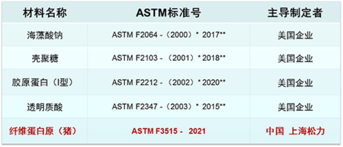 ASTM International自2000年以來(lái),共批準(zhǔn)發(fā)布了5個(gè)天然高分子材料的ASTM標(biāo)準(zhǔn),前4個(gè)均形成了龐大的產(chǎn)業(yè),且均為美國(guó)企業(yè)主導(dǎo)制訂。第5個(gè)為中國(guó)生物科技領(lǐng)軍企業(yè)-上海松力主導(dǎo)制訂