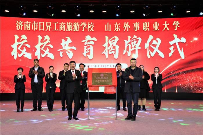 濟南市日昇工商旅游學(xué)校黨支部書記楊楠與山東外事職業(yè)大學(xué)副校長孫彤宇共同為山東外事職業(yè)大學(xué)“合作共建單位”揭牌。