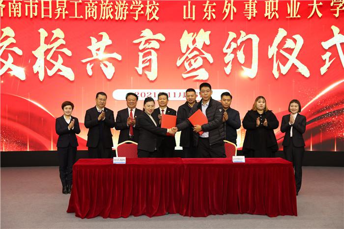 隨后,濟南市日昇工商旅游學(xué)校執(zhí)行校長管玉川與山東外事職業(yè)大學(xué)產(chǎn)教融合辦公室主任張榮家成功簽署校校共育協(xié)議。